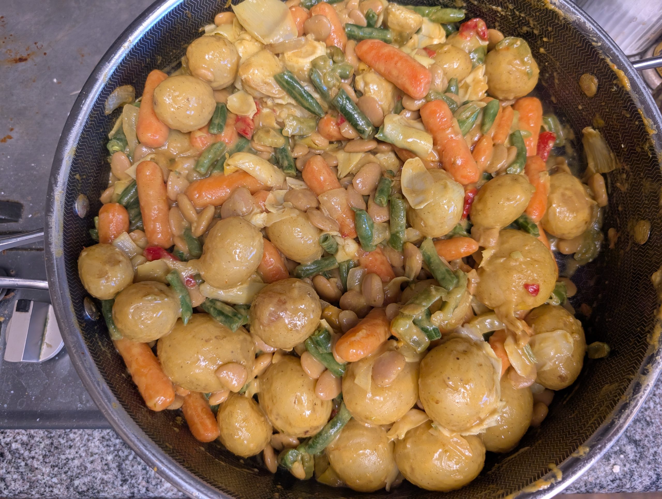 Last week it was a baby butter bean curry stir fry. Ingredients included onions, carrots, green beans, quartered artichoke hearts, baby potatoes, S&B curry powder and salt. I failed to add garlic, but should have. The flavor was too mild, but it was definitely highly nutritious with lots of fiber, protein and carbs.